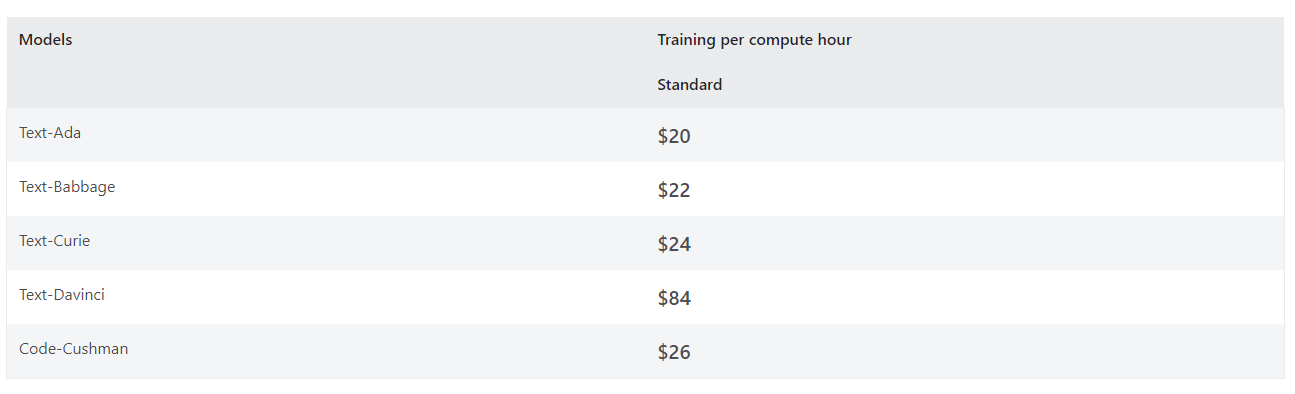 No momento, o tempo de treinamento é cobrado por hora de computação para treinamento e os preços variam de US$ 20 a US$ 84 por hora, dependendo do modelo básico selecionado. Semelhante à geração de token acima, os modelos mais simples são mais baratos por hora em comparação com os modelos básicos mais avançados.