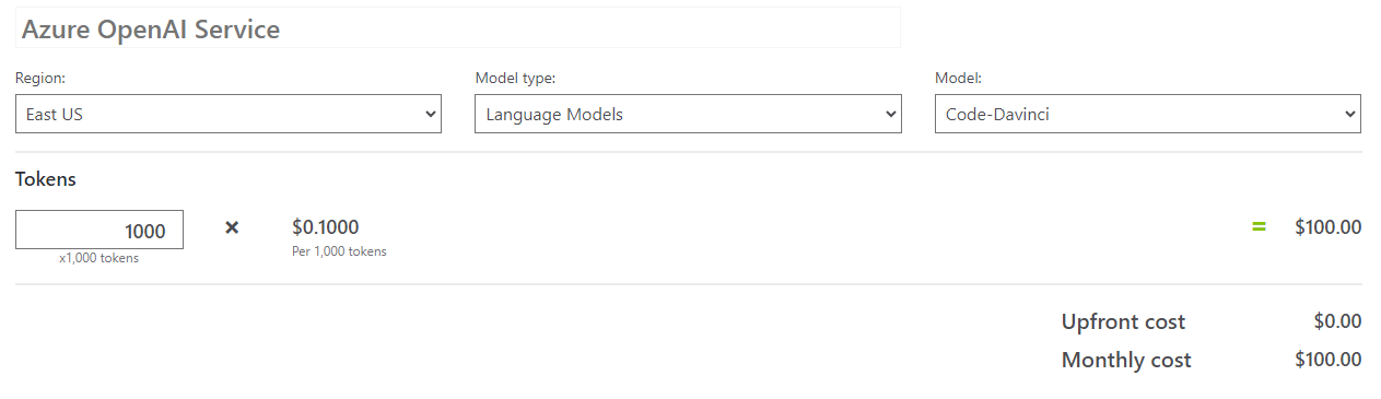 Nos modelos pré-treinados temos apenas o custo de uso por tokens, nesse ponto seria extremamente dificil estimar quantos tokens seriam usados em um mes, mas para termos uma média, fiz um calculo considerando 1 milhão de tokens.