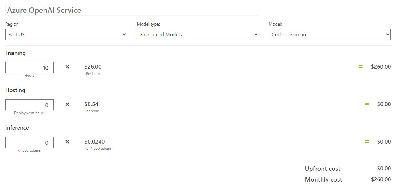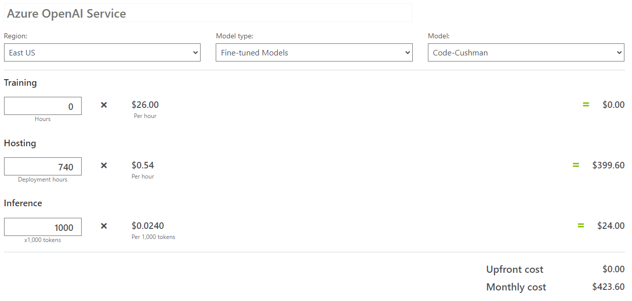 Por fim, depois que um modelo é implantado, os custos de uso padrão ainda se aplicam na forma de custos por mil tokens.