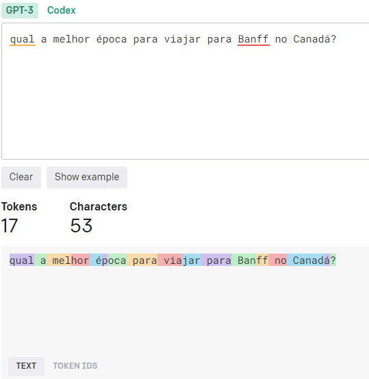 Por exemplo a pergunta qual a melhor época para viajar para Banff no Canadá? Poderia ser traduzida nos seguintes tokens: ["qual", "a", "melhor", "época", "para", "viajar", "para", "Banff", "no", "Canadá", "?"], mas utilizando a ferramenta de geração de tokens da própria OpenAI temos uma transformação em 17 tokens.