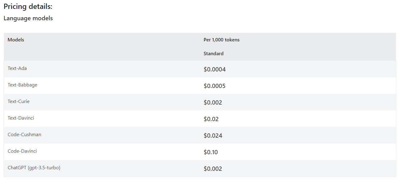 Fechando nossos modelos de texto está o ChatGPT conforme o comunicado de imprensa da Microsoft, o ChatGPT custa $ 0,002 USD por 1.000 tokens.