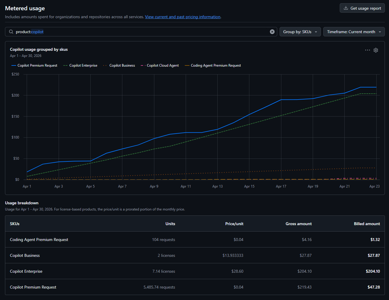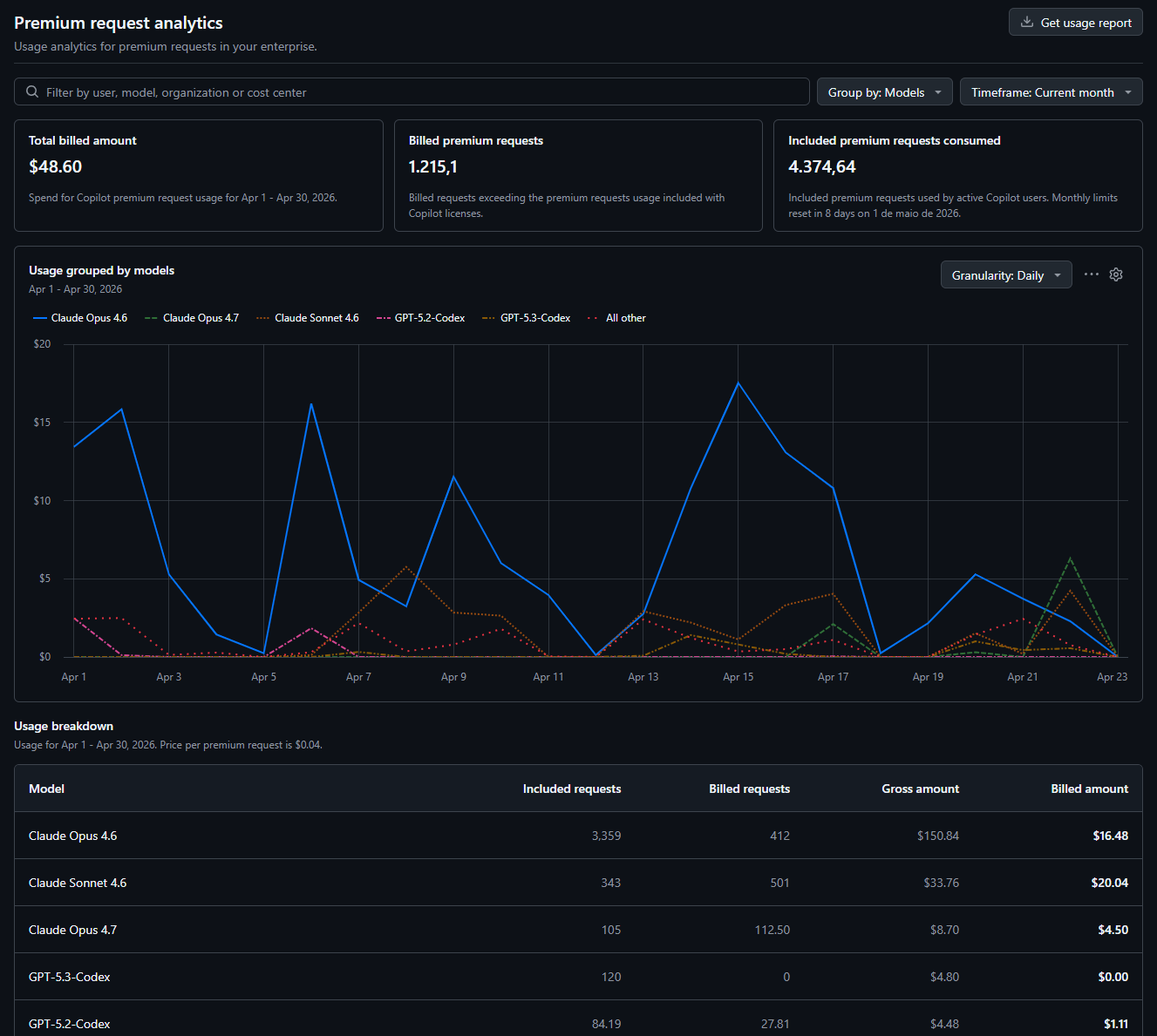 O Copilot Business resolve — ou pelo menos reduz drasticamente — o problema de previsibilidade. Não porque a Microsoft seja mais boazinha. É porque o modelo de seat com limite de premium requests é honesto sobre o custo. Você sabe que cada seat custa US$ 19, vem com 300 premium requests, e qualquer estouro é US$ 0,04 por request. Acabou. Sem surpresa de página de pricing mudando à noite.
