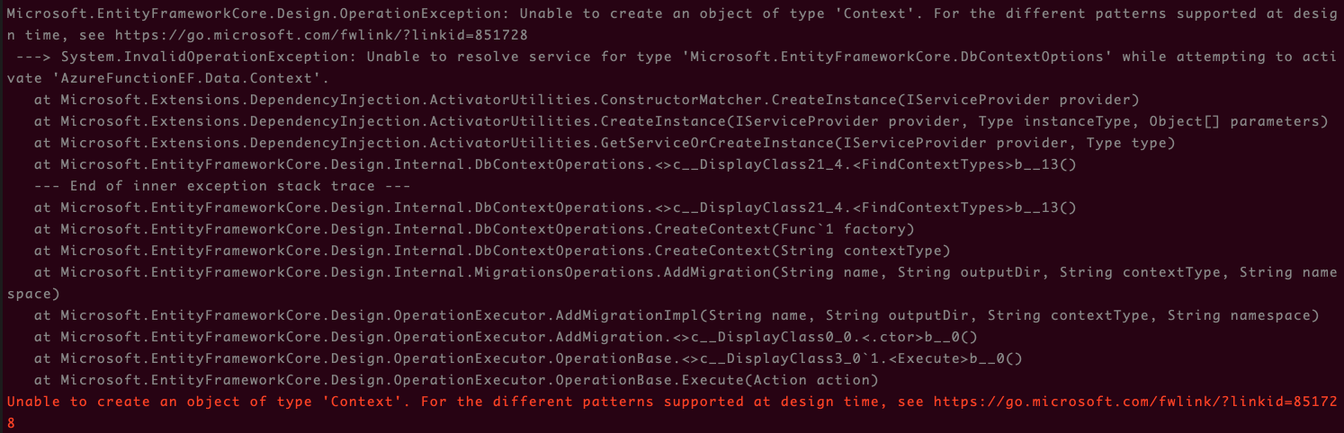 Microsoft.EntityFrameworkCore.Design.OperationException: Unable to create an object of type 'Context'