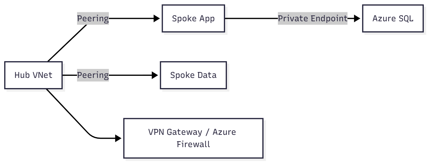 - Cada Spoke representa um ambiente isolado (por exemplo: “app”, “data”, “aks”).