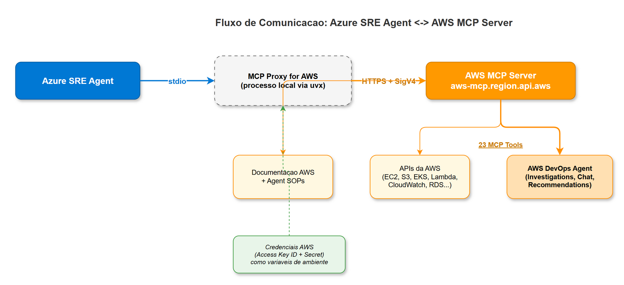 A AWS disponibiliza oficialmente um MCP Proxy for AWS, um servidor MCP que expõe 23 ferramentas organizadas em categorias distintas. Quando conectado ao Azure SRE Agent, ele dá acesso completo à infraestrutura AWS sem precisar sair do contexto da investigação.