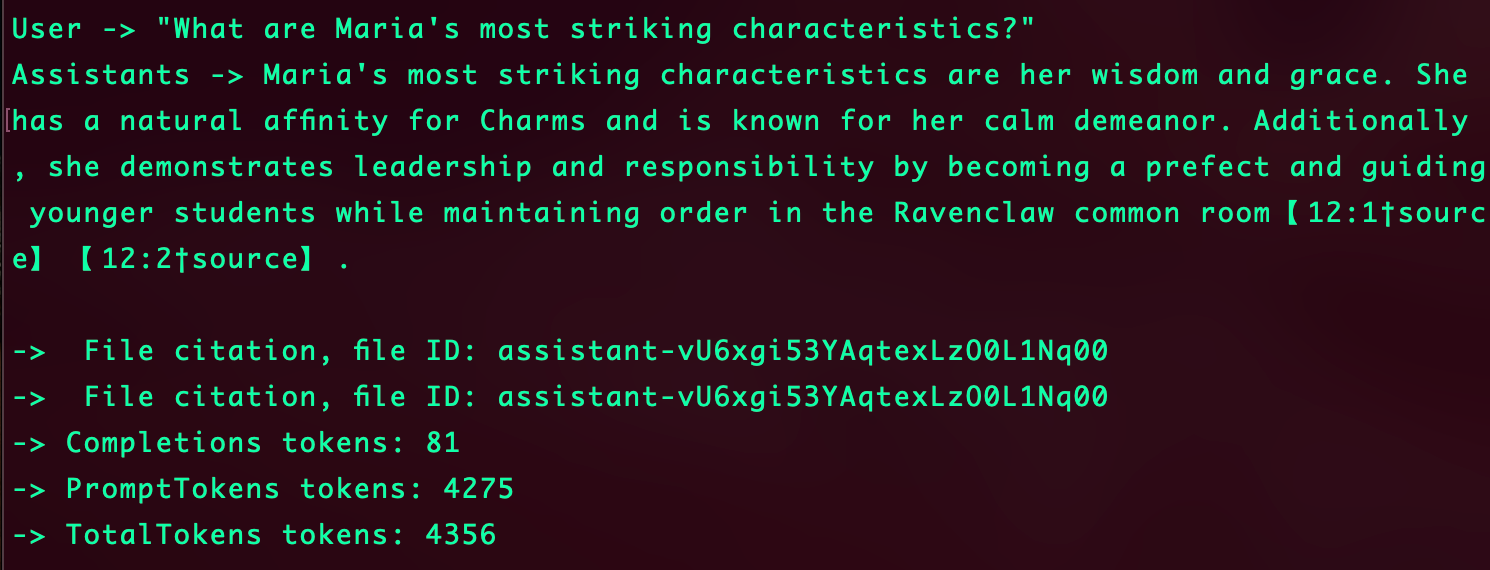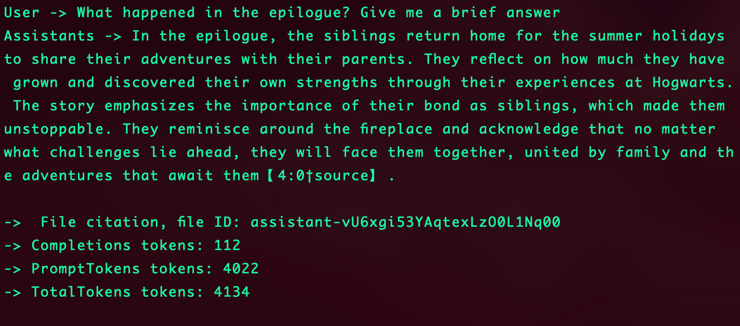 No loop abaixo, o assistente lê a mensagem digitada pelo usuário, envia a mensagem para o assistente, pede para o assistente processar a mensagem (pode ou não utilizar o file search), busca a última mensagem do histórico e exibe o resultado, as referências e os tokens utilizados.