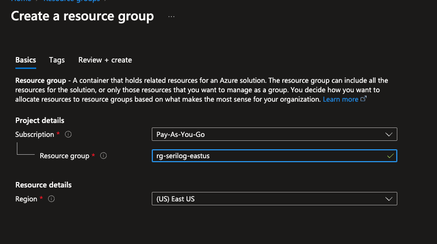 Vamos lá! Inicialmente vamos criar o grupo de recursos por meio do portal da Azure. Iremos chamá-lo de rg-serilog-eastus.