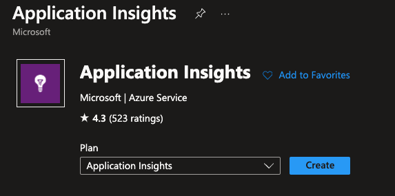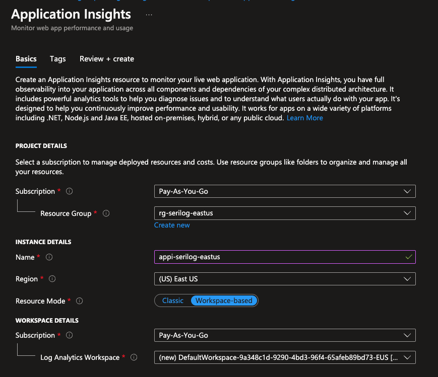 Dentro do recurso de nuvem criado, podemos criar uma instância do Azure Application Insights, com o nome de appi-serilog-eastus.