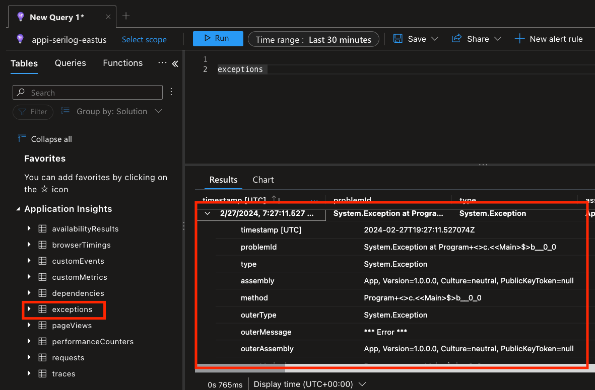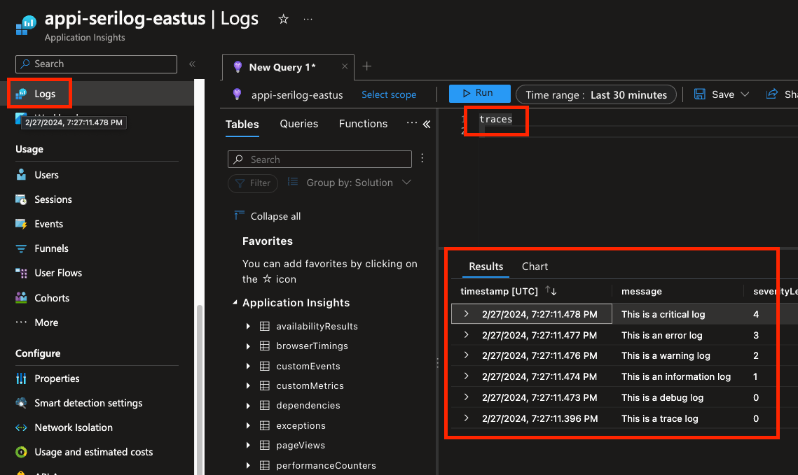 loggerConfig.WriteTo.ApplicationInsights("<your-connection-string>", new TraceTelemetryConverter());Com isso, podemos executar novamente a aplicação, chamar o endpoint e verificar que os logs foram criados dentro o Azure Application Insights!