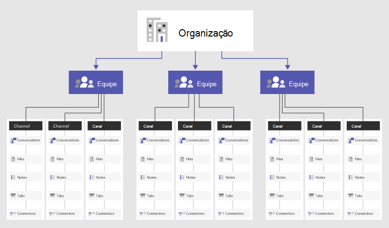 Dentro das equipes, você possui canais que representam um nível maior de granularidade na organização de times e tarefas. A imagem abaixo ilustra bem como eles se encaixam nessa estrutura.