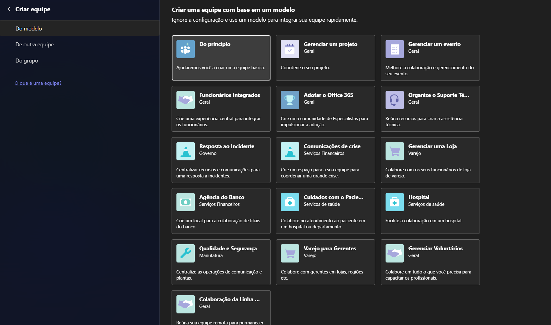 As equipes são estruturas que você cria para reunir um grupo de usuários com uma finalidade em comum e que podem ser divididos em canais de acordo com a necessidade, como organizar um projeto, um setor ou a comunicação com clientes você poderá adicionar aplicativos de forma mais coordenada e ampla dentro de cada canal. Você pode criar equipes com base em modelos pré-definidos pela Microsoft, uma função ainda pouco explorada pelas organizações.