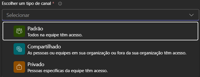 | Privado | Apenas membros específicos convidados para o canal. | Assuntos confidenciais (ex: orçamento, RH) restritos a um subgrupo da Equipe. | Cria um site do SharePoint restrito e independente para garantir a segurança dos arquivos. |