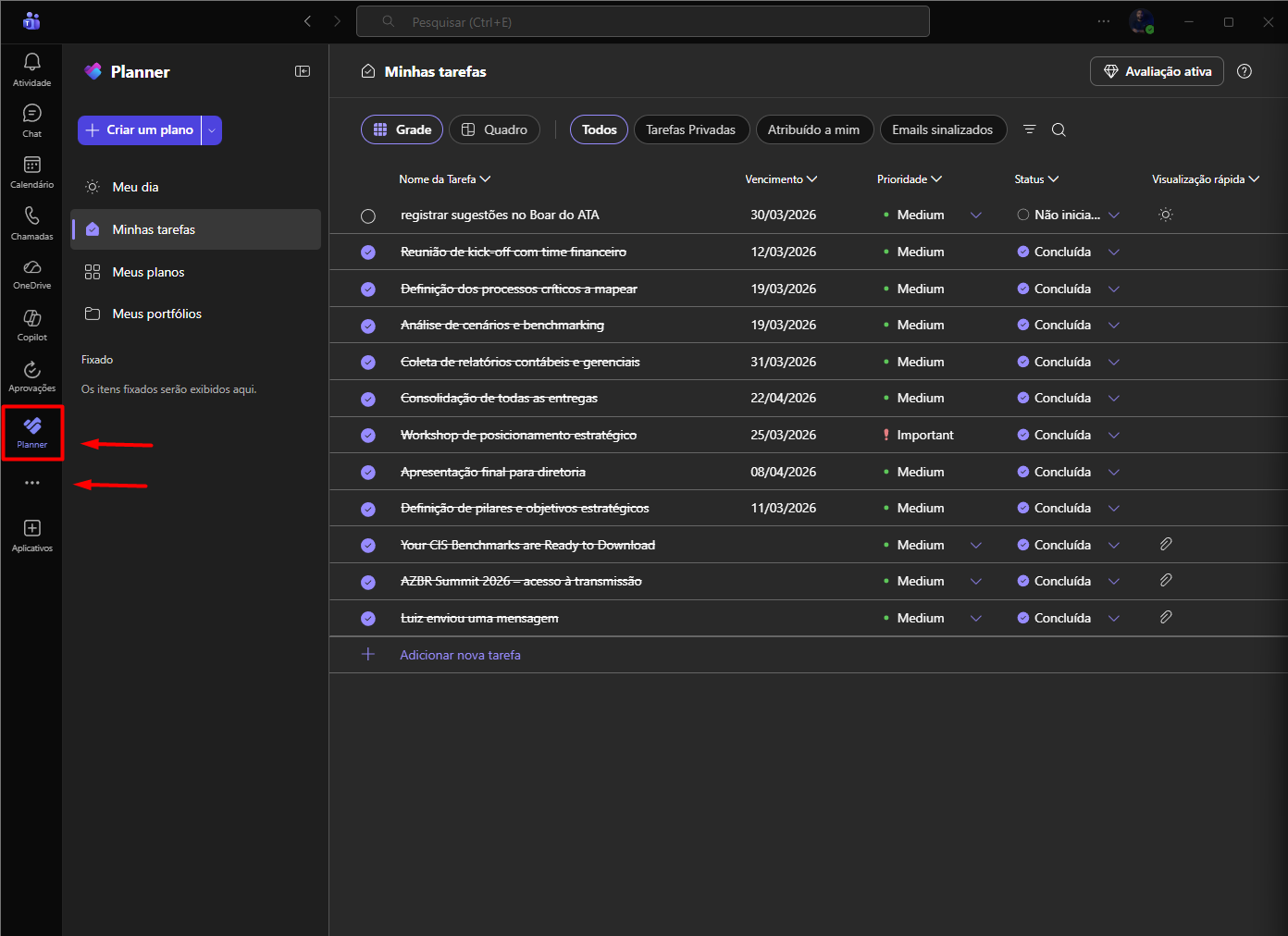 Microsoft Planner é a ferramenta de gerenciamento de tarefas do M365. Com ele, você organiza o trabalho do time em quadros visuais no estilo Kanban, criando planos com colunas, tarefas, responsáveis, prazos e prioridades. Cada tarefa pode ter checklists, anexos e comentários. A integração com o Teams permite fixar um plano como uma aba dentro de um canal, deixando as tarefas do projeto visíveis e acessíveis para todos os membros sem sair do ambiente de colaboração. Ele também se conecta ao Microsoft To Do, que consolida as tarefas individuais atribuídas a você no Planner junto com suas listas pessoais, criando uma visão unificada de tudo que está pendente.