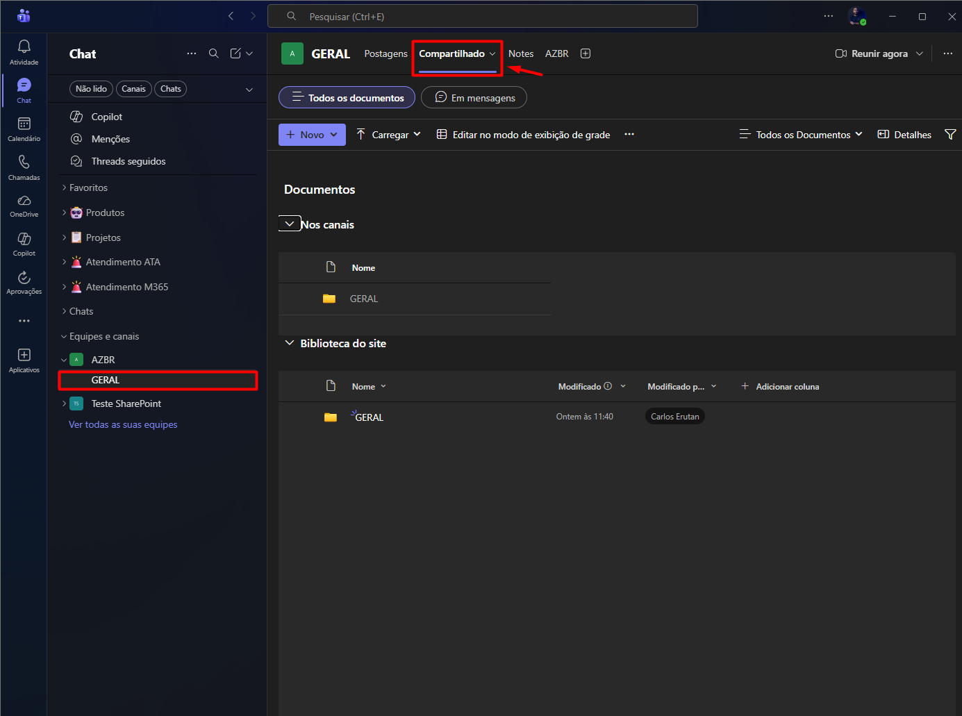 Pela opção "Compartilhado" dentro do Teams é possível visualizar pastas e arquivos, estruturar o armazenamento de um projeto e definir níveis de permissão granulares: quem pode visualizar, editar ou gerenciar cada conteúdo. Além disso, o SharePoint suporta versionamento de arquivos, permitindo recuperar versões anteriores de um documento em caso de edições indesejadas. Para organizações mais maduras, ele também é a base para a criação de intranets corporativas, portais de comunicação interna e páginas de times com notícias, links úteis e recursos centralizados.