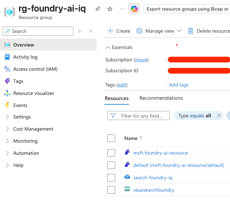 Aqui podemos ver os recursos de nuvem criados dentro do resource group chamado rg-foundry-ai-iq.