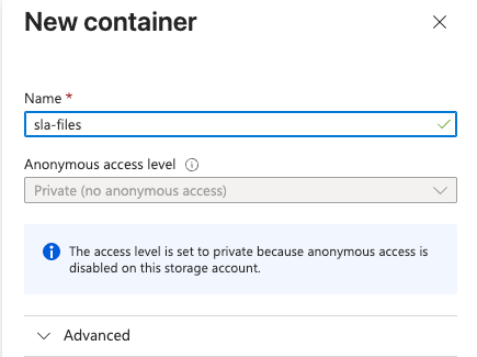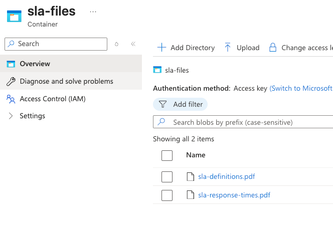 Agora vamos preparar os dados. Indo para o Storage Account, vamos criar um container chamado sla-files e fazer o upload dos arquivos disponíveis no repositório oficial desta série de artigos: