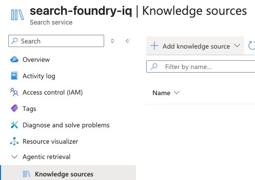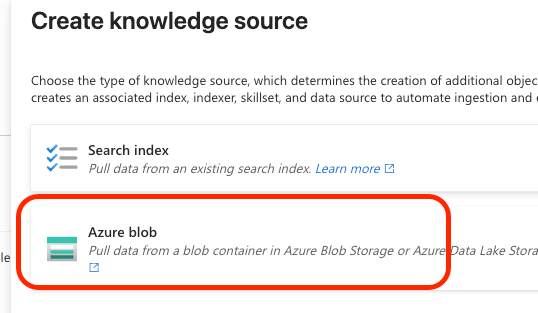 Com o modelo gpt-4.1-mini criado e os arquivos já no Blob Storage, podemos partir para o Azure AI Search. Dentro do recurso de AI Search criado, vamos configurar uma fonte de dados (Knowledge source) apontando para o Blob Storage.