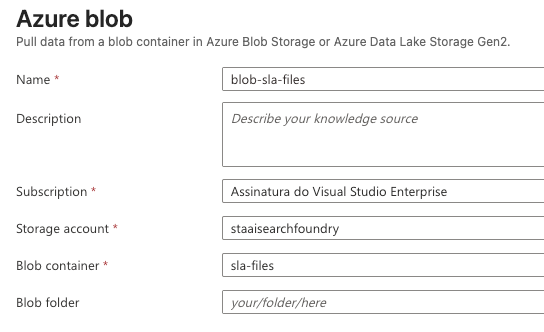 Vamos selecionar o Blob Storage como origem e, no passo de configuração, informar o container sla-files recém-criado.