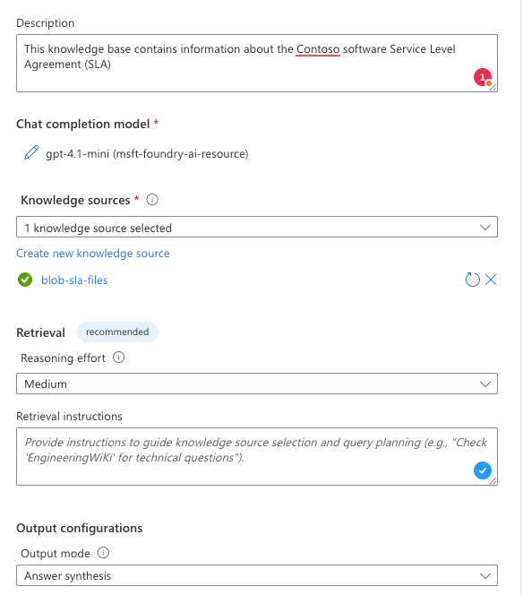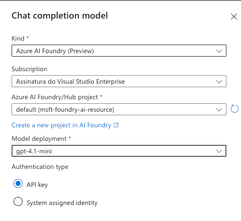 Durante a criação da Knowledge Base, precisamos selecionar qual modelo de chat completions do Microsoft Foundry será utilizado. Aqui, vamos selecionar o gpt-4.1-mini que fizemos deploy anteriormente.