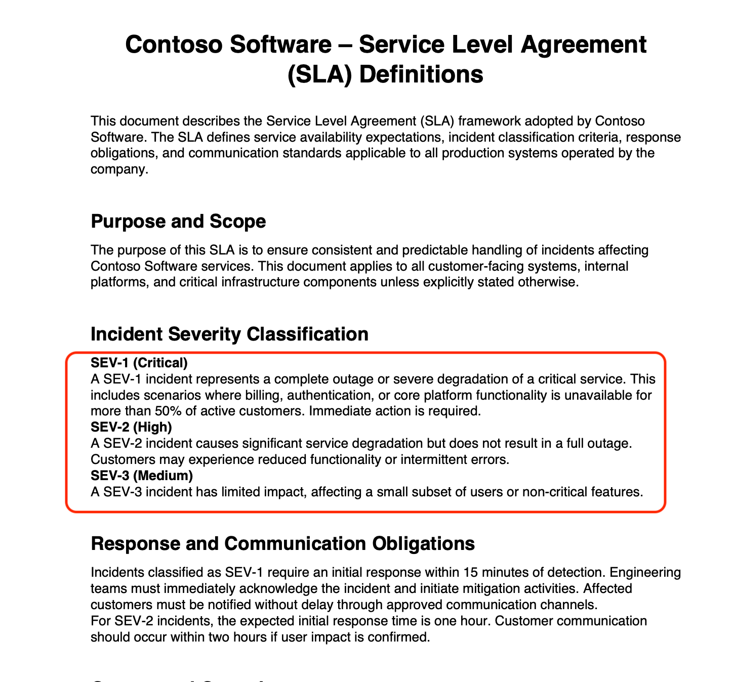 A ideia é que esses documentos sirvam como nossa base inicial de conhecimento, permitindo perguntas de suporte/operacional (como classificação de severidade e prazos de resposta).