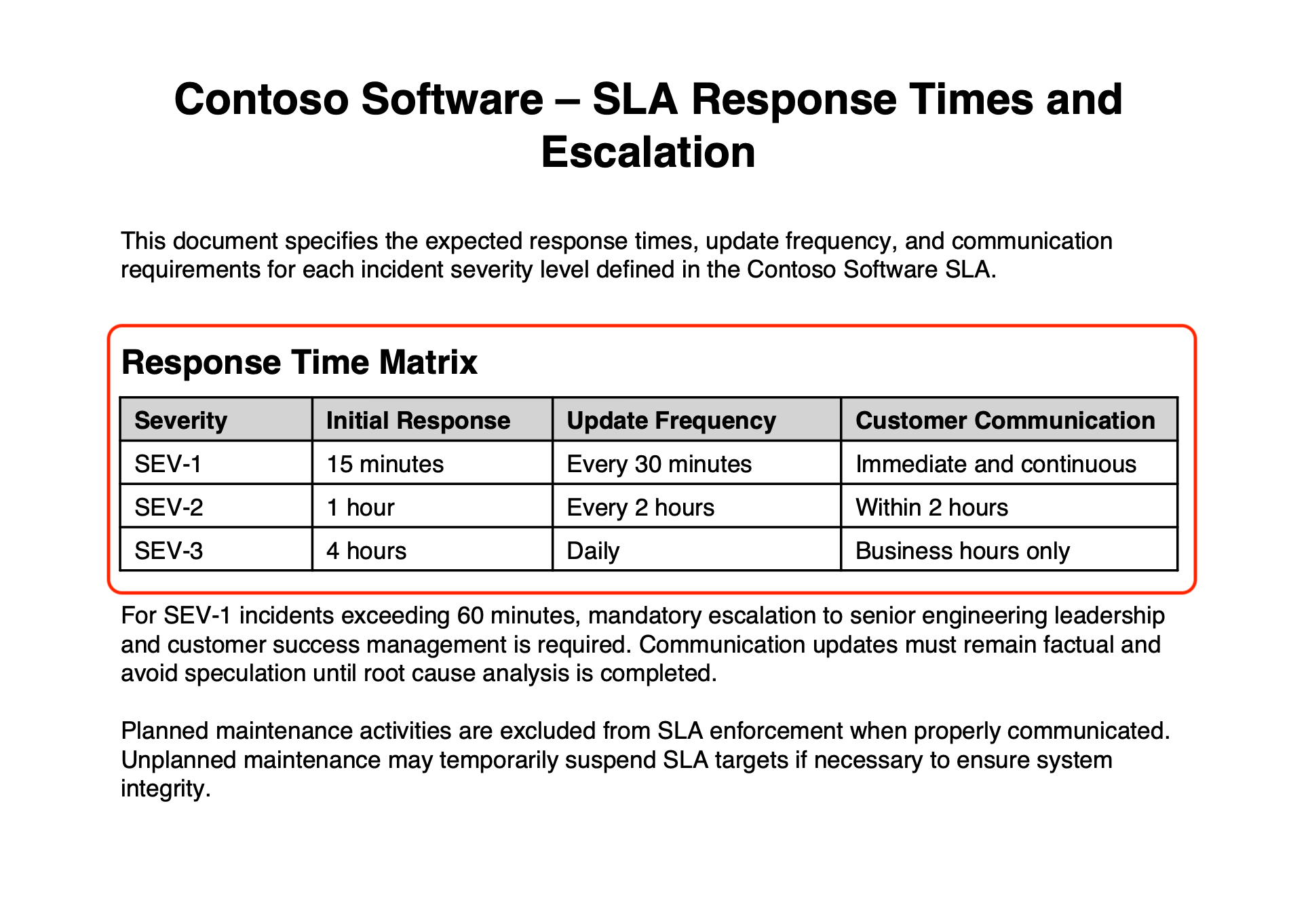 A partir daqui, nesta Parte 1, vamos implementar um cenário prático para a empresa fictícia Contoso Software: criar uma base de conhecimento que consome documentos de um Blob Storage via Azure AI Search, para que um knowledge agent responda perguntas sobre classificação de severidade e tempos de resposta (SLA) usando agentic retrieval.