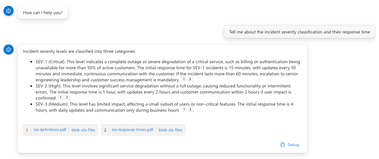 Com a Knowledge Base criada, já podemos testar o fluxo diretamente na portal web da Azure, fazendo perguntas ao knowledge agent (que vai utilizar agentic retrieval para buscar nas fontes e montar a resposta). Vamos perguntar: “tell me about te incident severity classification and their response time”