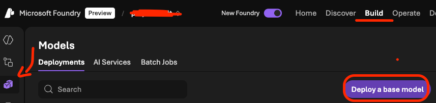 Com o Microsoft Foundry criado, o próximo passo é fazer o deploy de um modelo gpt-4.1-mini, que será usado no fluxo do nosso knowledge agent. Para isso, vamos acessar https://ai.azure.com, selecionar o projeto, clicar em Build e depois em Models.