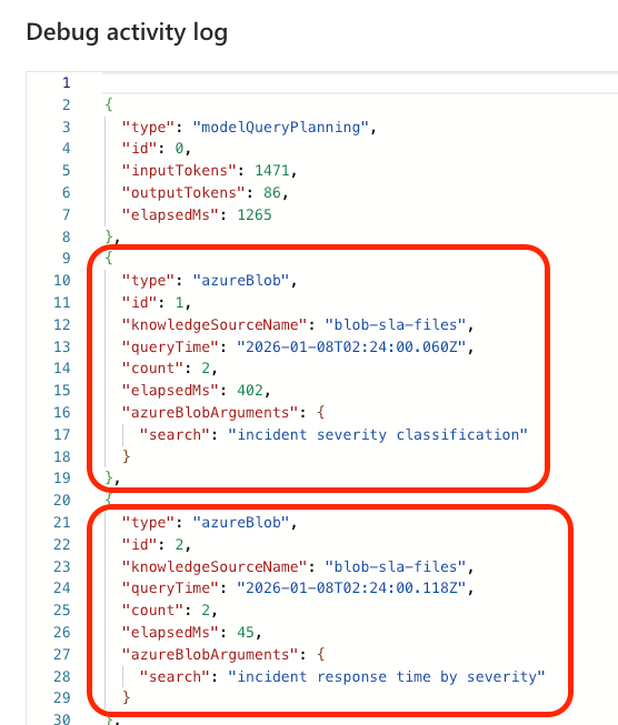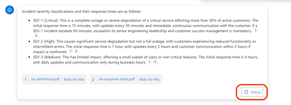 Se clicarmos em Debug, conseguimos enxergar as subqueries que foram geradas e executadas em paralelo: em vez de uma busca única, o knowledge base “quebra” a pergunta em intenções menores (por exemplo, uma parte para classificação de severidade e outra para tempos de resposta), recupera evidências de pontos diferentes do conteúdo e então aplica reranking para priorizar o que faz mais sentido no contexto da pergunta. Esse fluxo de recuperação iterativa é o que torna o agentic retrieval tão útil em perguntas que dependem de mais de um documento ou de mais de um trecho relevante.