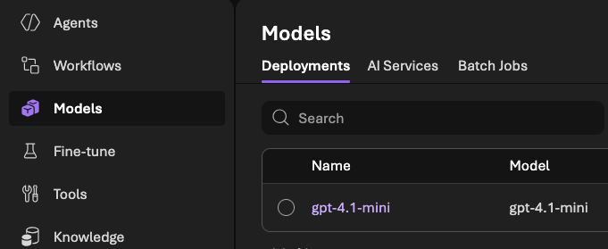 Com isso em mente, vamos entrar no portal do Microsoft Foundry (https://ai.azure.com) e, antes de tudo, garantir que o modelo gpt-4.1-mini está criado e pronto para uso no projeto, já que ele será o modelo principal do agente nesse post.