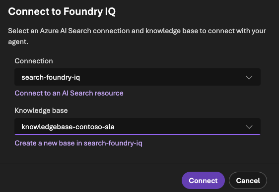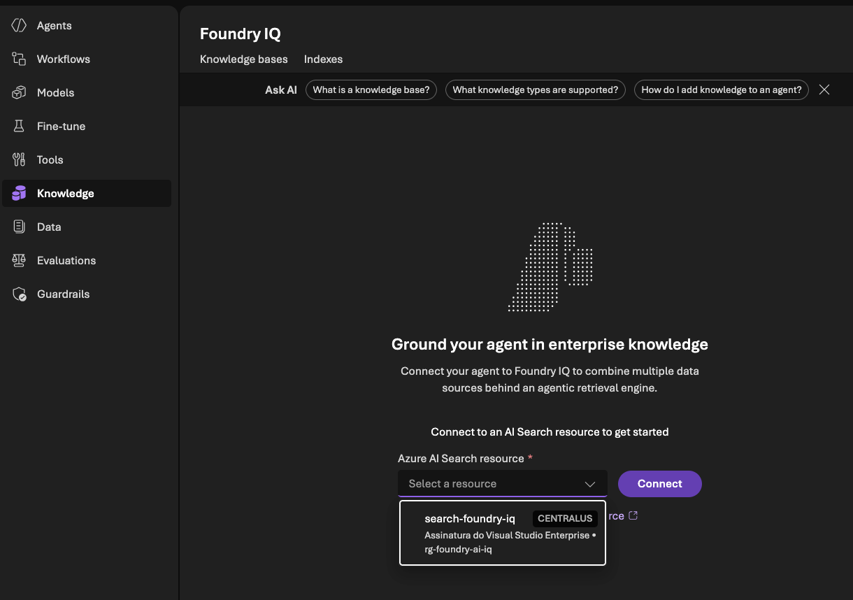 O passo central aqui é vincular o agente ao conhecimento via Foundry IQ. Para isso, vamos selecionar a conexão do AI Search Resource adicionada no passo anterior e, em seguida, escolher a Knowledge Base correta.