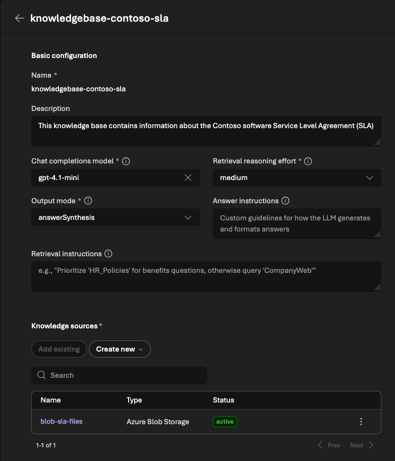 Após a conexão, já conseguimos validar o resultado: a knowledge base deve aparecer importada corretamente, e com acesso a apenas uma knowledge source, que, no nosso post, corresponde aos documentos ingeridos a partir do Azure Blob Storage.