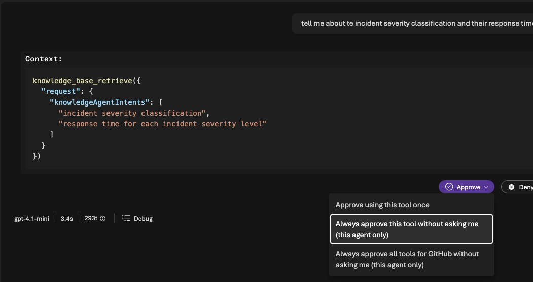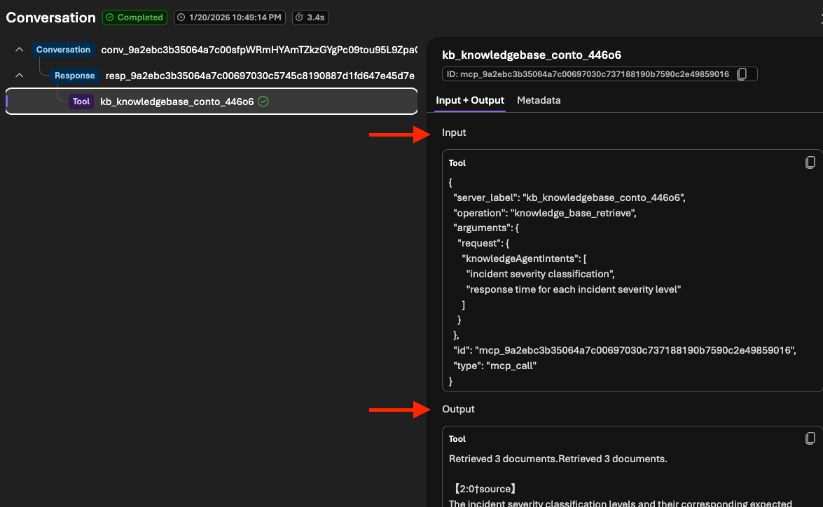 Agora vamos clicar em Debug. É nesse modo que conseguimos ver claramente que a chamada do agente à knowledge base é feita via MCP, como mostrado abaixo: