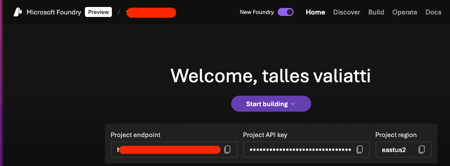 O valor de projectUrl, necessário para conectar ao projeto do Microsoft Foundry, pode ser encontrado na página principal do portal do Foundry: