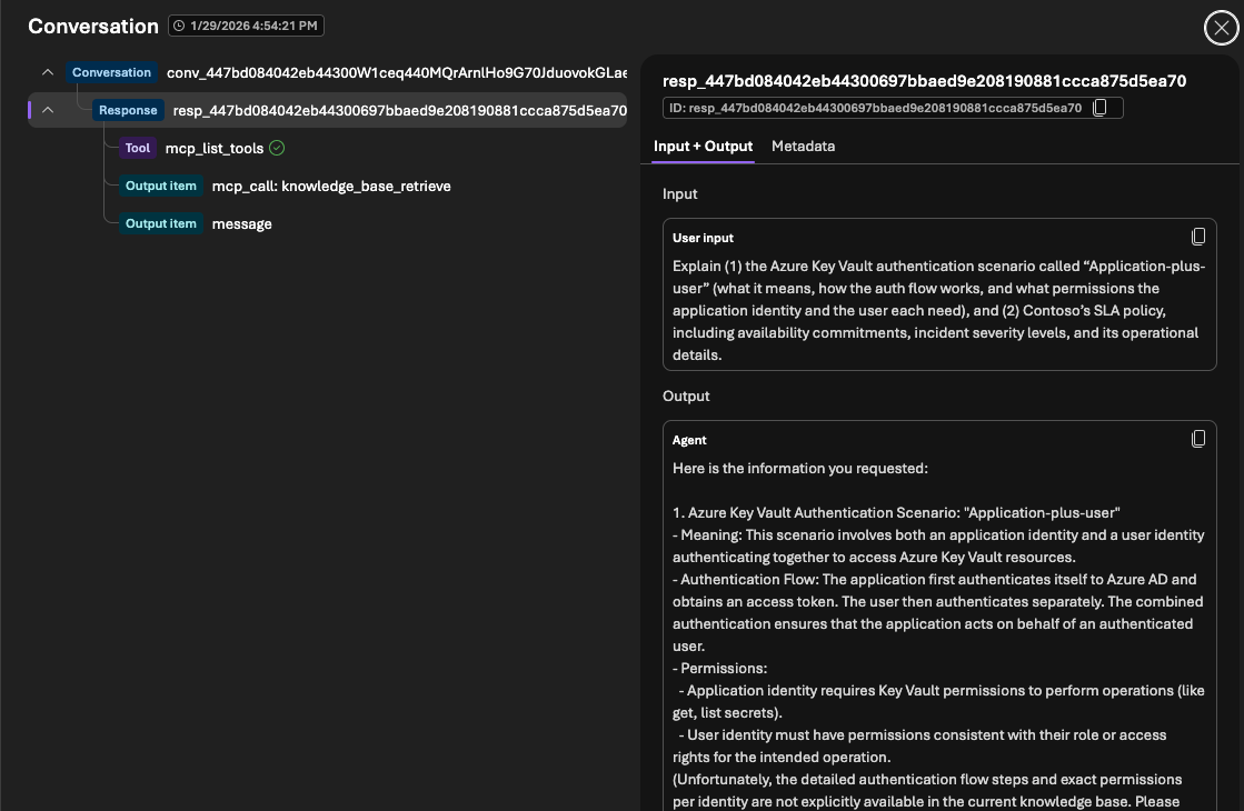 Além disso, podemos acessar novamente o portal do Foundry para verificar os dados da execução diretamente na interface web, incluindo histórico da conversa, uso de tokens e muito mais: