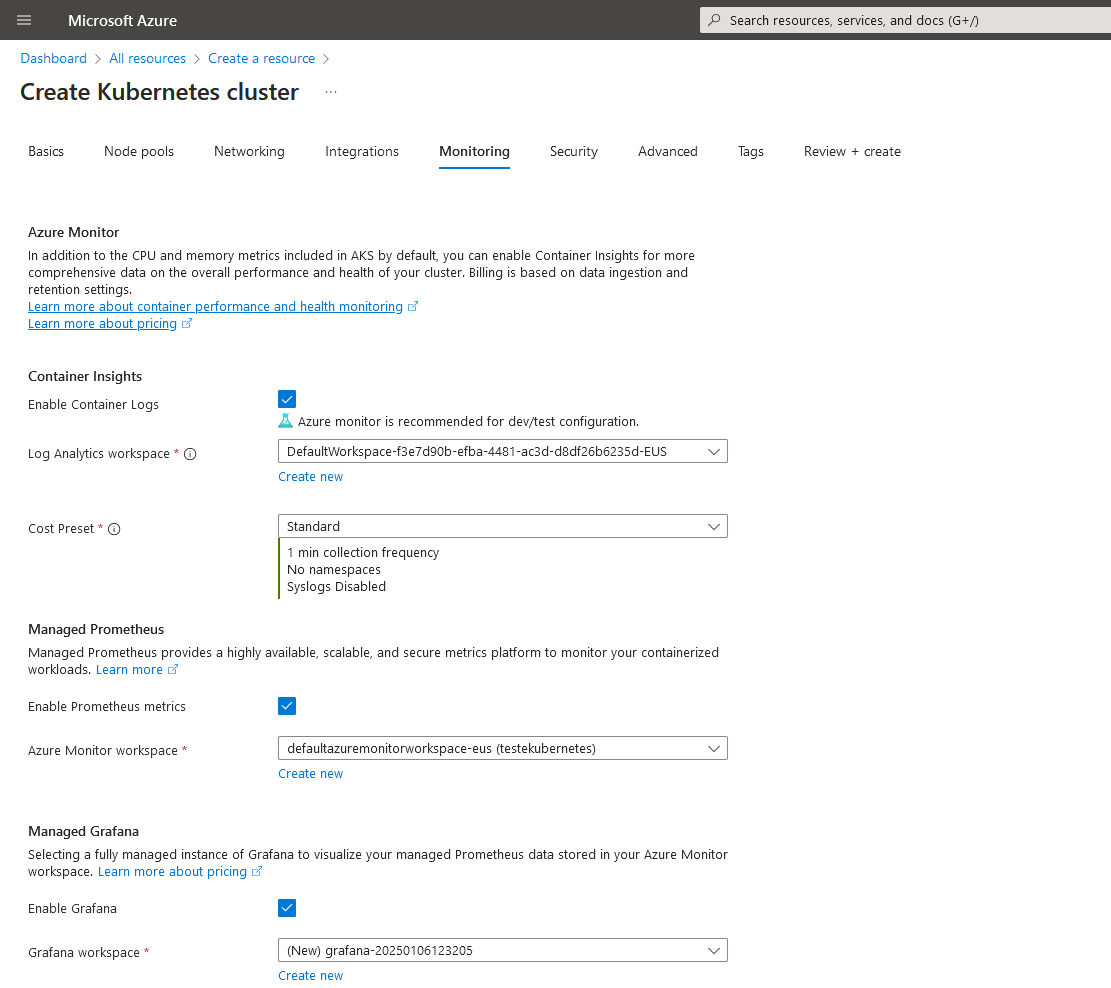 Habilitar o Managed Grafana permitirá que tiremos proveito tanto de informações coletadas por meio do Azure Monitor e Log Analytics, quanto de métricas obtidas via Prometheus: