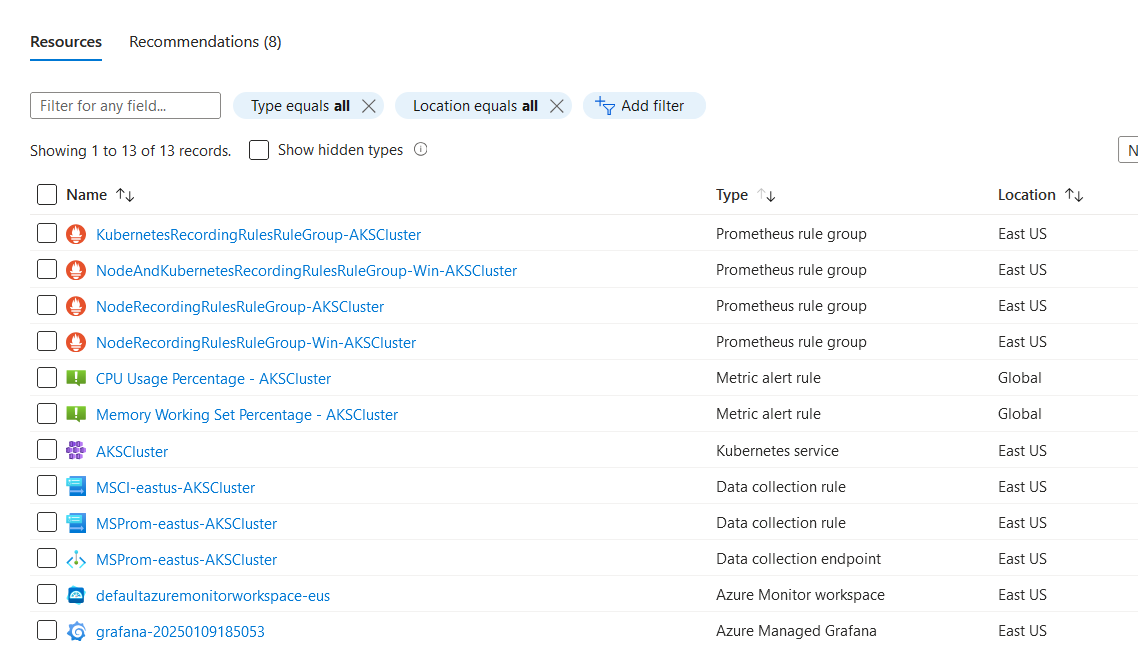 Com recurso do AKS já criado notaremos a presença de uma instância do Azure Managed Grafana no grupo de recursos em que o mesmo se encontra, bem como itens do tipo Prometheus rule group: