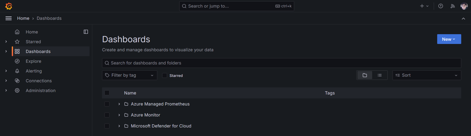 Esta instância do Azure Mananaged Grafana já terá vários dashboards pré-instalados e separados em 3 grupos (Azure Managed Prometheus, Azure Monitor e Microsoft Defender for Cloud):