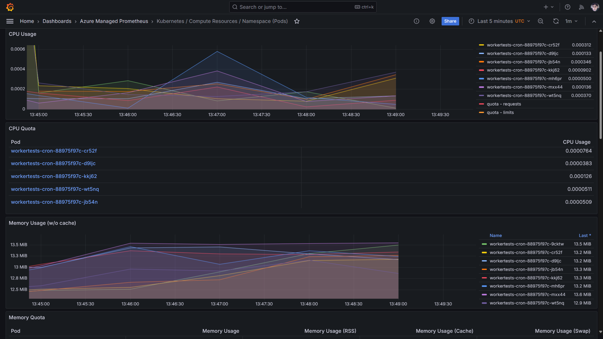 Já na próxima imagem temos em destaque um desses dashboards - Kubernetes / Compute Resources / Namespace (Pods):