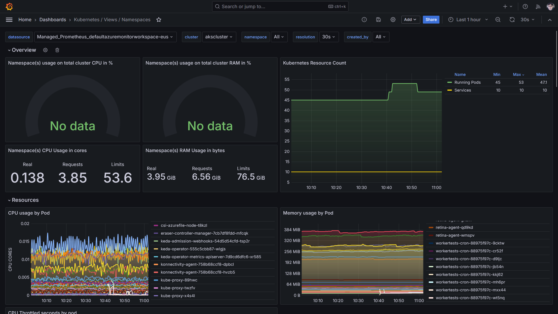 O Azure Kubernetes Service (AKS) também dispõe de uma integração facilitada com soluções de monitoramento/observabilidade como Grafana e Prometheus. O uso de métricas do Prometheus em conjunto com dashboards pré-existentes do Grafana (ou até a criação de novos dashboards customizados) pode inclusive estender as capacidades de monitoramento originais do Azure Monitor, com novas visões sobre diferentes aspectos de um cluster.