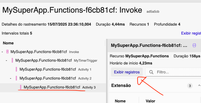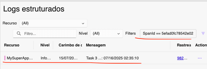 Além disso, podemos ver os logs relativos a cada span: