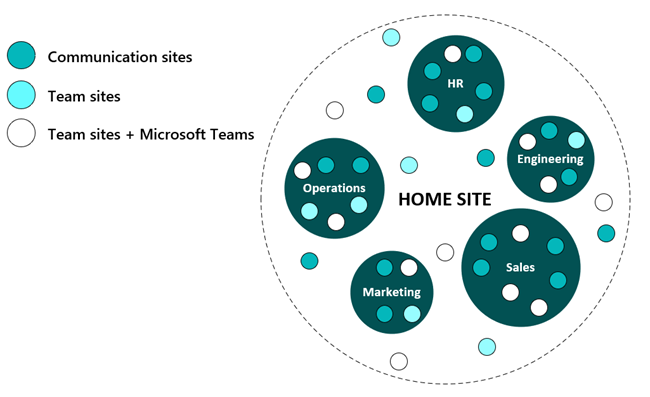 - A Estrutura Moderna: Crie um Site de Equipe independente para cada departamento (RH, TI, Financeiro). Se eles precisarem de um portal em comum, conecte-os a um Site Hub (Hub Site).