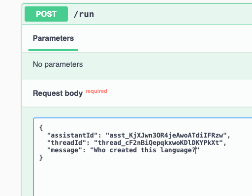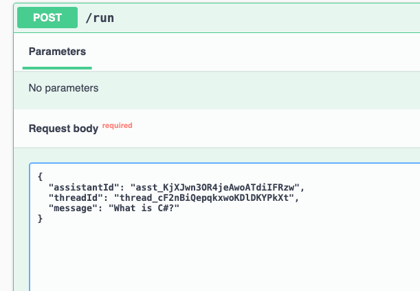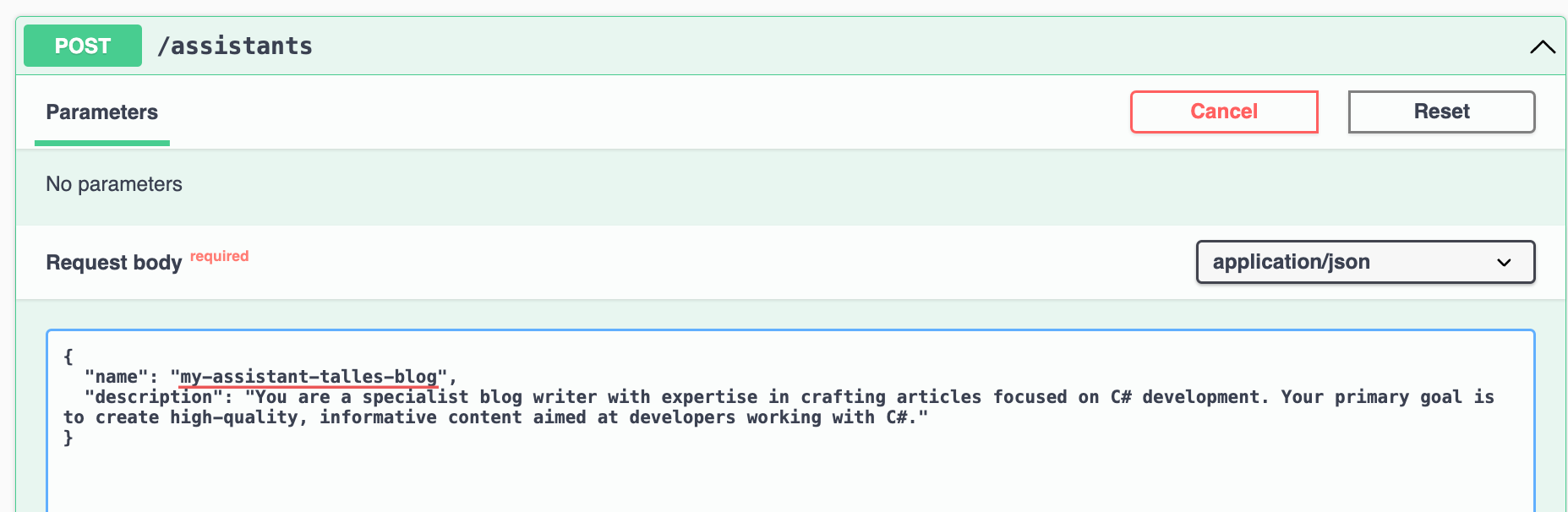 .WithOpenApi();Aqui está um exemplo de chamada para o endpoint de criação de assistentes: