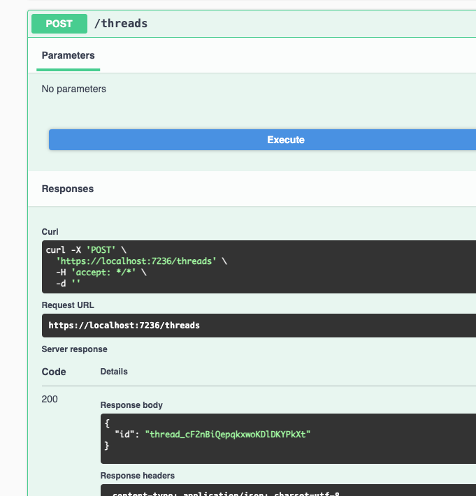 #pragma warning restore OPENAI001 // Type is for evaluation purposes only and is subject to change or removal in future updates. Suppress this diagnostic to proceed.Com o novo método pronto, podemos criar o novo endpoint para criação de threads.