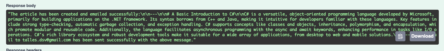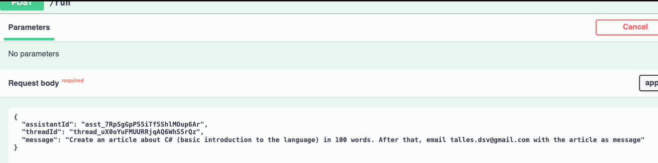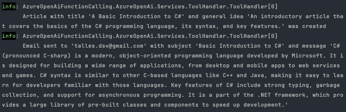 while (threadRun.Status == RunStatus.Queued || threadRun.Status == RunStatus.InProgress);Com isso pronto, podemos criar um novo prompt. Nesse exemplo, irei pedir para o assistente criar um artigo sobre C# e depois enviar para o meu e-mail. Dessa forma, o assistente deverá utilizar as duas tools criadas anteriormente.