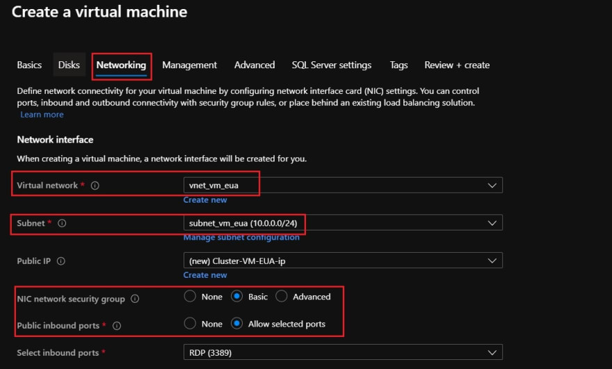Podemos ver que por atrelarmos esta VM no RG que fica na região East US, ele pegou a primeira VNet (e única) disponível e já atribui às interfaces.