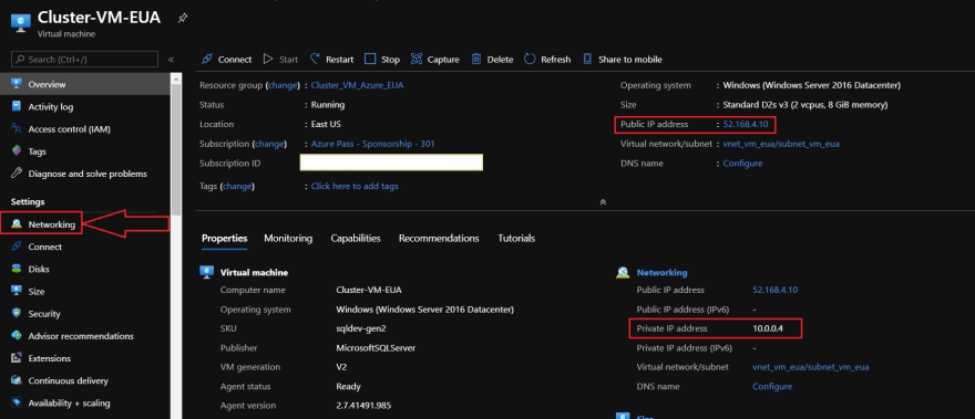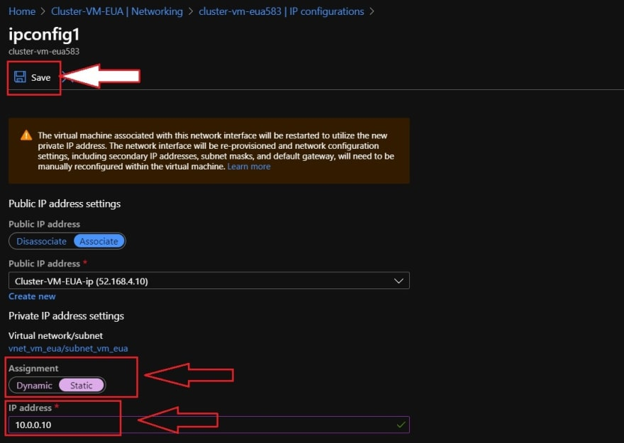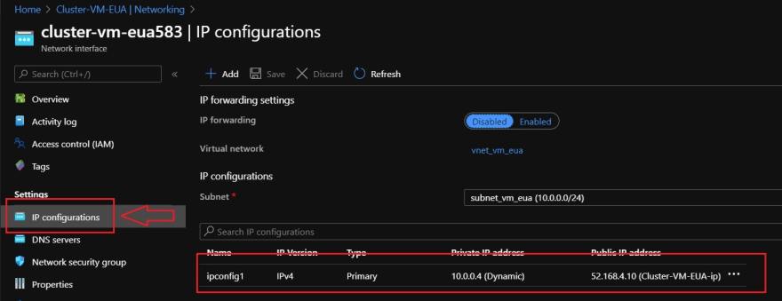 O Azure atribuiu um IP Publico à nossa máquina virtual e também um IP Privado, porém esse privado é entregue via DHCP, precisamos garantir que ele seja estático para que não haja troca do IP após um boot na VM.