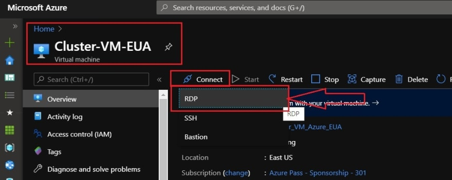 No ARM (Azure Resource Manager) vá na sua máquina virtual e clique em Connect, após isso, clique em RDP para acessar o Remote Desktop Protocol.