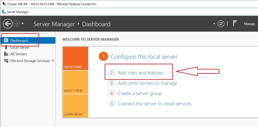 Acesse o Server Manager e clique em Dashboard, depois em Add roles and features.