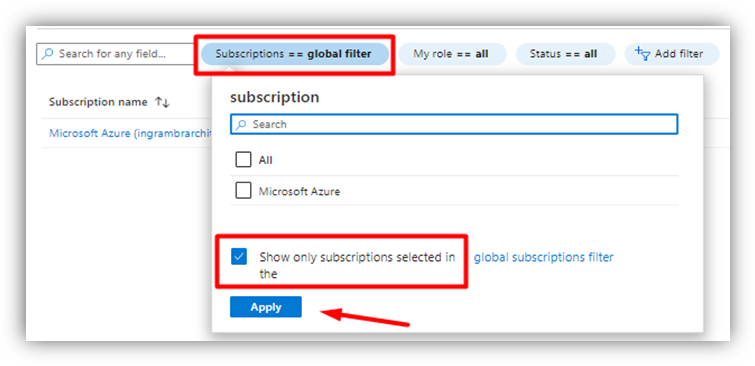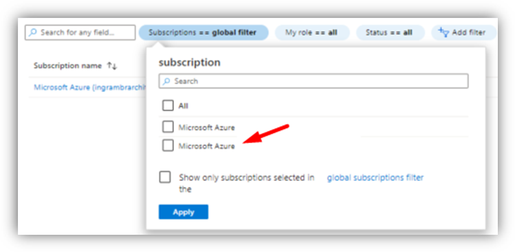 - Clique em Subscriptions == global filter e desmarque a opção “Show only subscriptions selected…” e clique em Apply e a nova assinatura aparecerá: